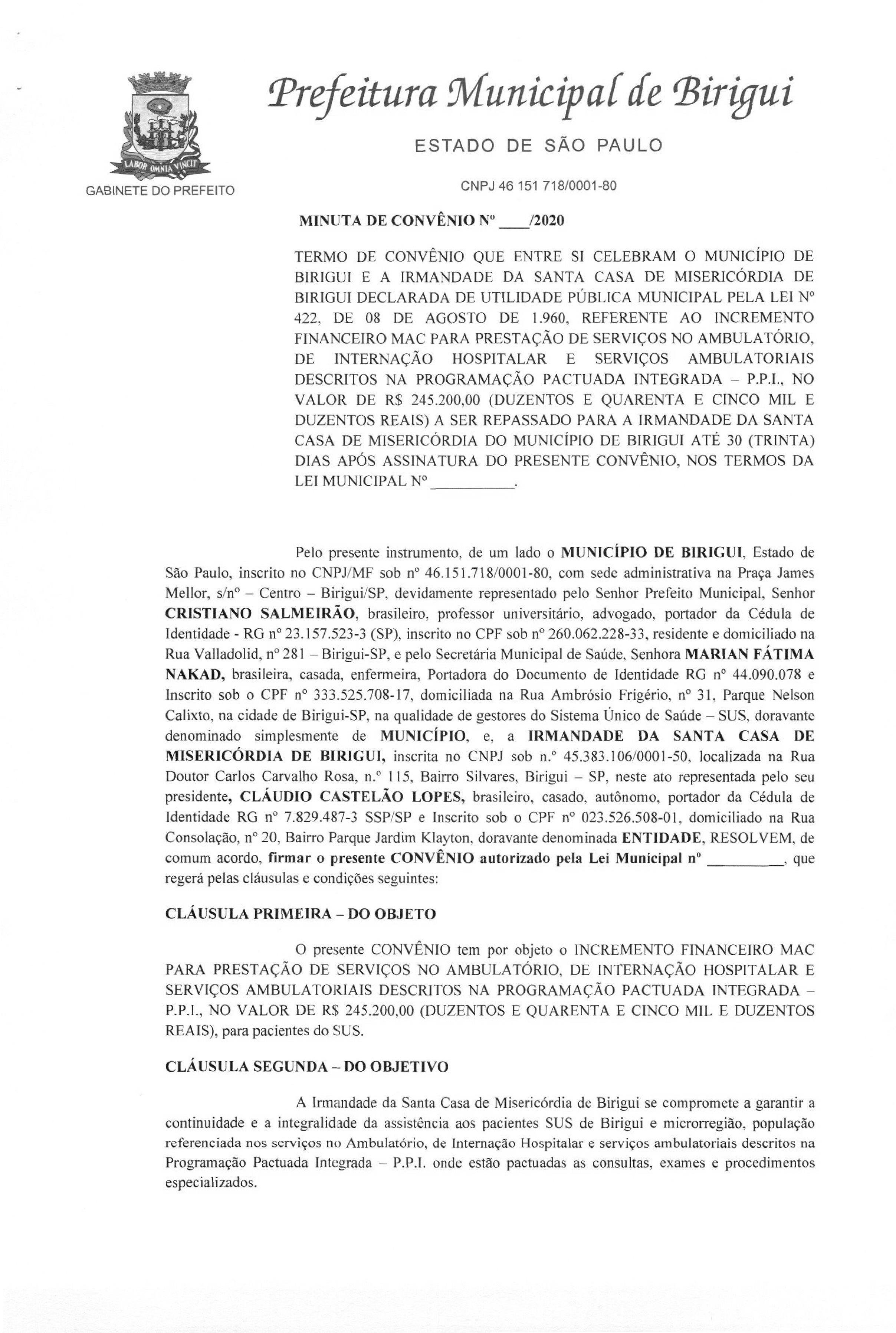 AUTORIZA A CELEBRAÇÃO DE CONVÊNIO ENTRE O MUNICÍPIO DE BIRIGUI E A IRMANDADE DA SANTA CASA DE MISERICÓRDIA DE BIRIGUI DECLARADA DE UTILIDADE PÚBLICA MUNICIPAL PELA LEI N° 422, DE 8 DE AGOSTO DE 1960, REFERENTE AO INCREMENTO FINANCEIRO MAC PARA PRESTAÇÃO DE SERVIÇOS NO AMBULATÓRIO, DE INTERNAÇÃO HOSPITALAR E SERVIÇOS AMBULATORIAIS DESCRITOS NA PROGRAMAÇÃO PACTUADA INTEGRADA — P.P.I., NOS TERMOS QUE ESPECIFICA E PROVIDÊNCIAS CORRELATADAS.