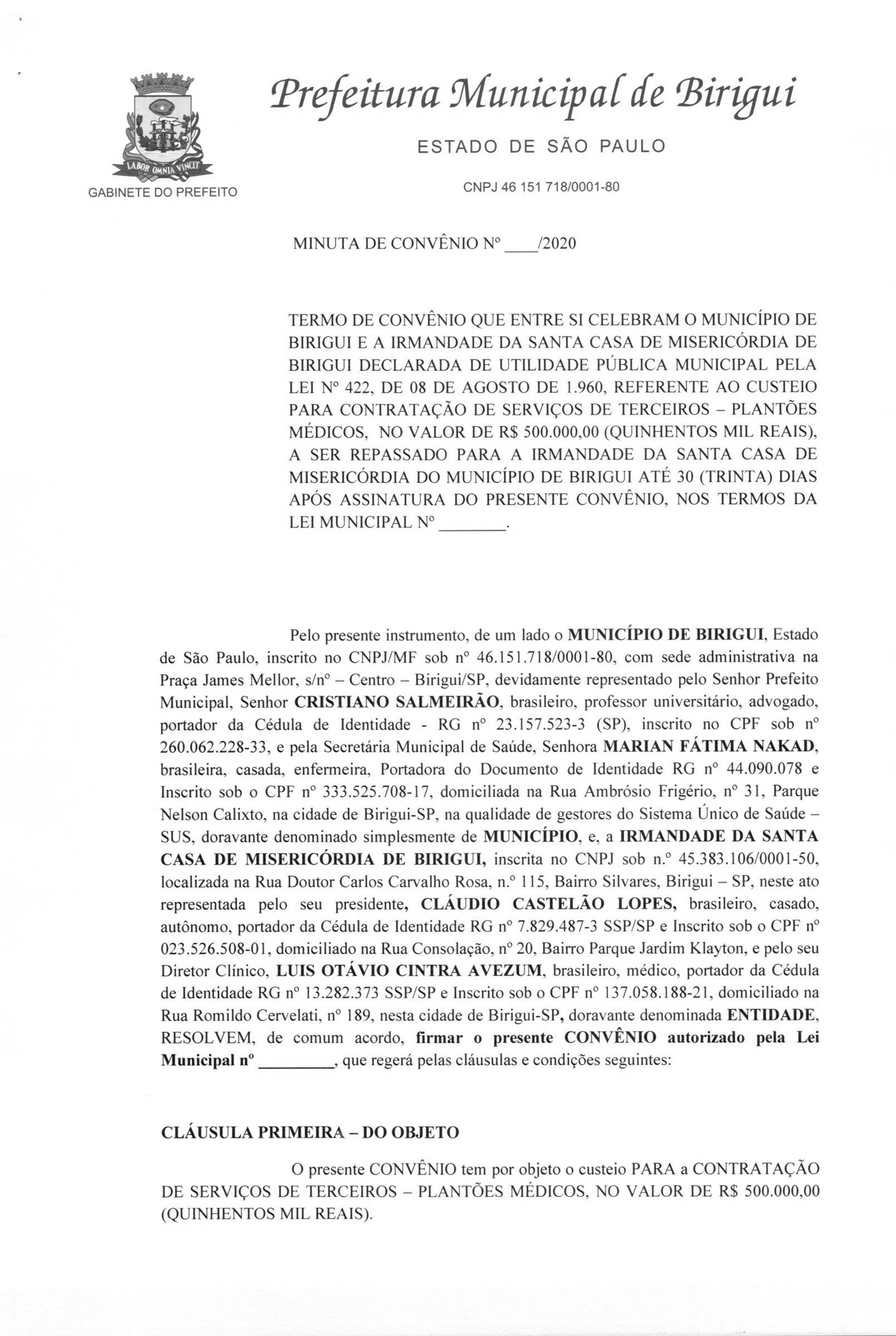 AUTORIZA A CELEBRAÇÃO DE CONVÊNIO ENTRE O MUNICÍPIO DE BIRIGUI E A IRMANDADE DA SANTA CASA DE MISERICÓRDIA DE BIRIGUI DECLARADA DE UTILIDADE PÚBLICA MUNICIPAL PELA LEI N° 422, DE 8 DE AGOSTO DE 1960, REFERENTE AO CUSTEIO PARA MANUTENÇÃO DOS ATENDIMENTOS MÉDICOS HOSPITALARES, NOS TERMOS QUE ESPECIFICA E PROVIDÊNCIAS CORRELATADAS.