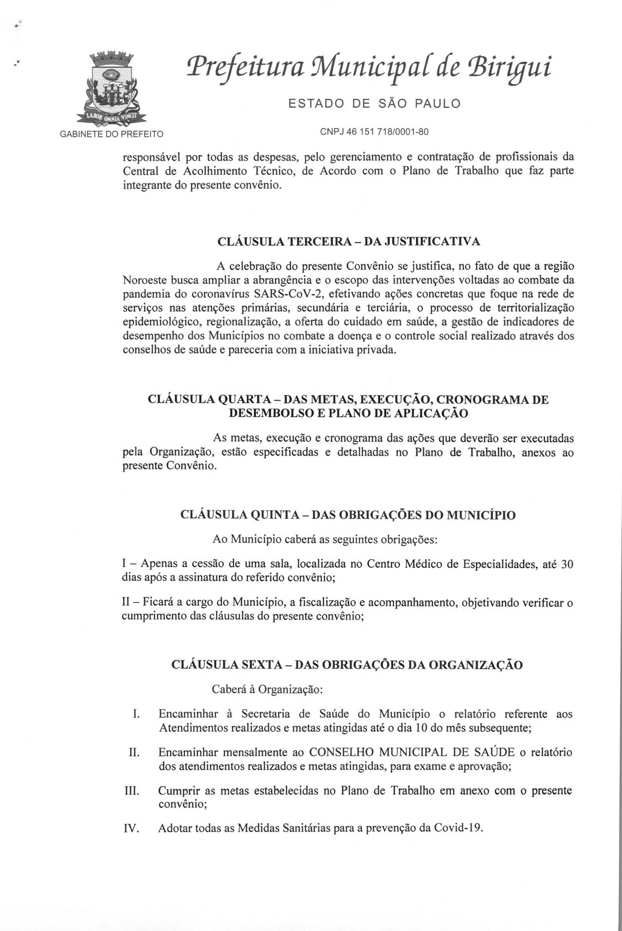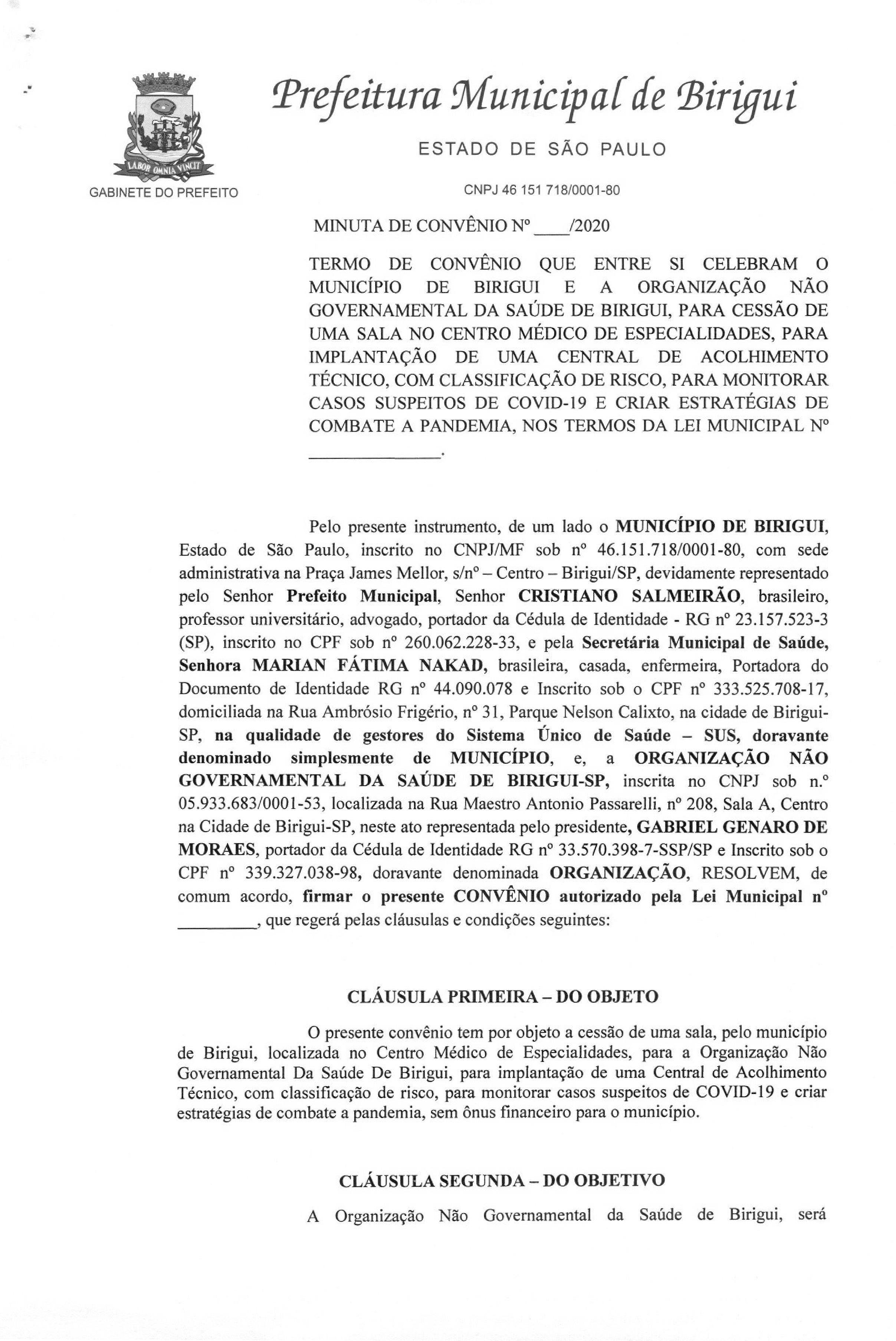 AUTORIZA A CELEBRAÇÃO DE CONVÊNIO ENTRE O MUNICÍPIO DE BIRIGUI E A ORGANIZAÇÃO NÃO GOVERNAMENTAL DA SAÚDE DE BIRIGUI, PARA CESSÃO DE UMA SALA NO CENTRO MÉDICO DE ESPECIALIDADES, PARA IMPLANTAÇÃO DE UMA CENTRAL DE ACOLHIMENTO TÉCNICO, COM CLASSIFICAÇÃO DE RISCO, PARA MONITORAR CASOS SUSPEITOS DE COVID-19 E CRIAR ESTRATÉGIAS DE COMBATE A PANDEMIA, NOS TERMOS QUE ESPECIFICA E PROVIDÊNCIAS CORRELATADAS.
